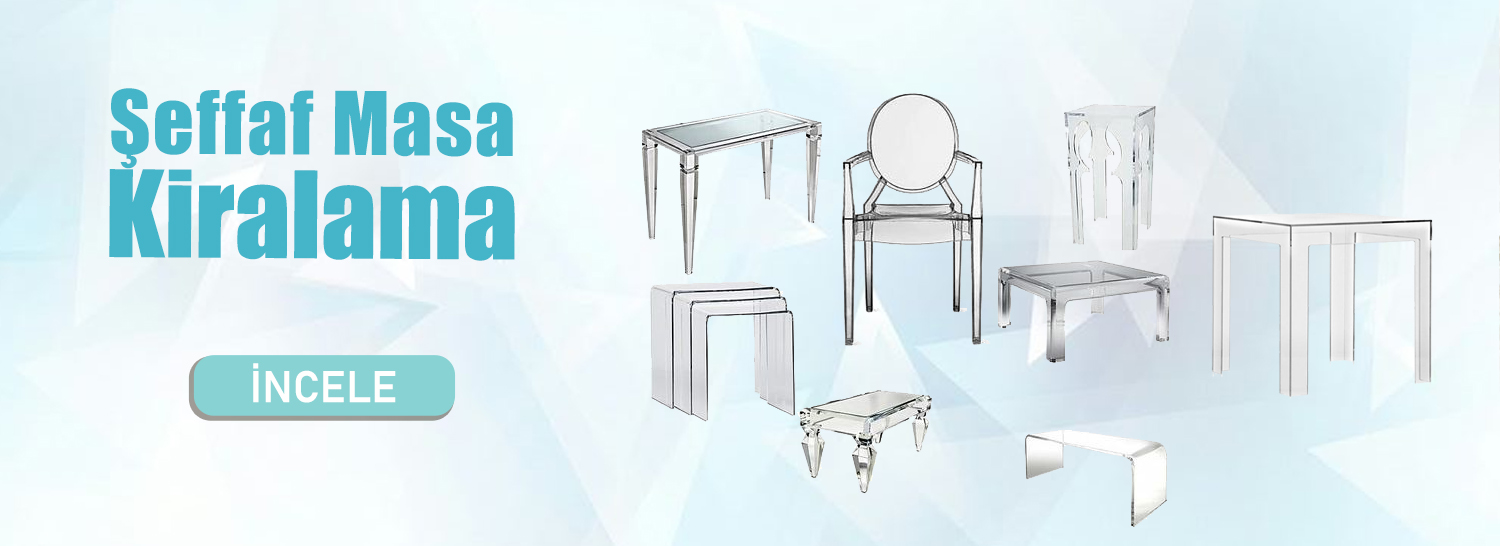 Şeffaf masa kiralama hizmetimizde şeffaf pleksi masalar, şeffaf sandalyeler, ferforje ayaklı şeffaf objeler ve çeşitli akrilik mobilyalar bulunmaktadır. Bu modeller modern dekorasyon stillerine oldukça yakışmaktadır.
